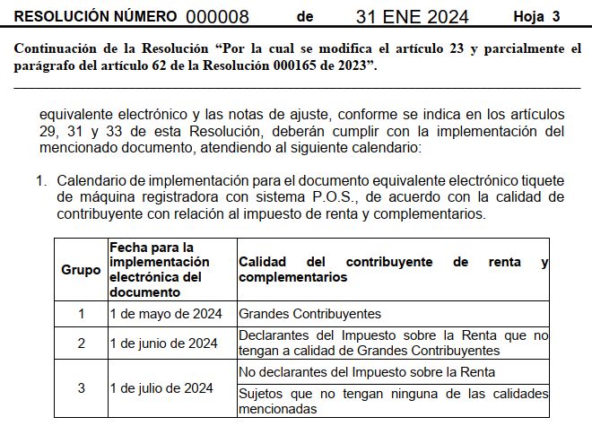 La DIAN establece por medio de la resolución 165(2023) y 008(2024) que a partir de junio de 2024 los parqueaderos (y todas las empresas) que sean facturadores electrónicos (responsables de IVA) y atiendan a sus clientes con software POS, deben cambiar a atender a sus clientes con POS Electrónico (documento equivalente) o realizar a todos sus clientes factura electrónica.