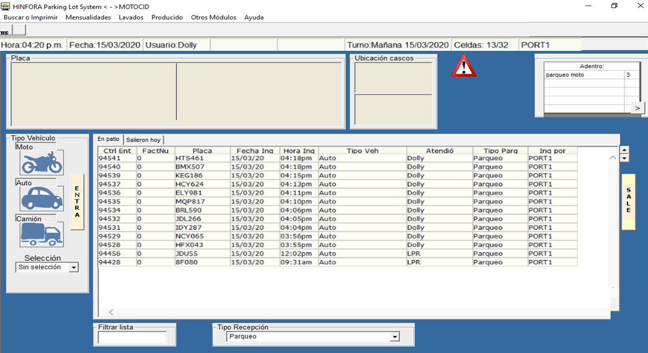 Sistema para la administración y prestación de servicios de su parqueadero que integra los procesos más frecuentemente utilizados como mensualidades, lavadero, retiros a caja y registro de otros ingresos. Los módulos tienen la facilidad de ser ajustables a su forma de trabajo en la sección preferencias. Además, cuenta con servicios cómo detección automática del tipo de vehículo al ingresar la placa, impresión de código de barra en el recibo de entrada para agilizar la atención de salida al cliente, registro de ubicación de los cascos para facilitar su almacenamiento y entrega, imprimir lista de placas de vehículos en patio (inventario), alerta de mensualidades vencidas, liquidación de operarios de lavado diario, entre otras.